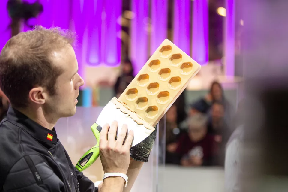 During the World Chocolate Masters event held in Paris Chef Lluc Crusellas representing Spain created a very delicate 3D honeycomb stamp, which allows him to make a very thin chocolate impression into his praline mould. Besides being very delicate it is also a very interesting tool that can be used in daily chocolate production.
